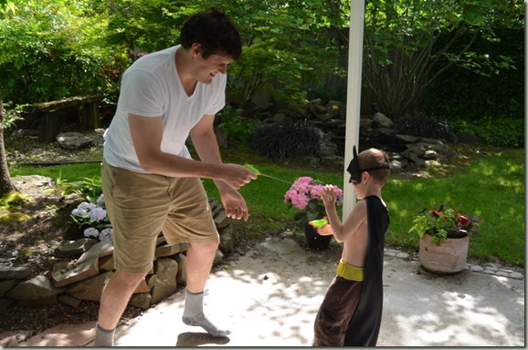 meaning I hung some crepe paper streamers, blew up a few balloons, and Joseph picked out some sticky-hands and squirt-guns as party favors! Wheeeeee!